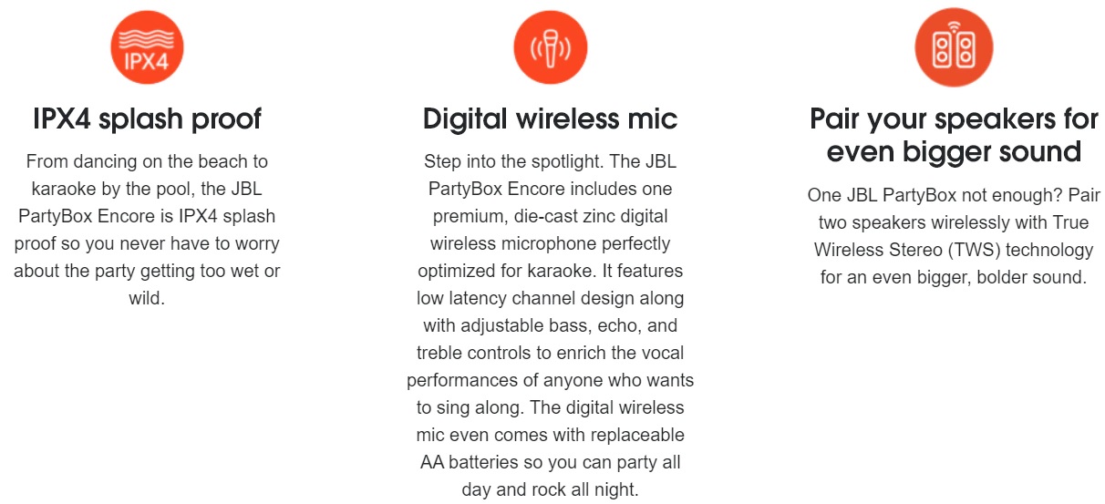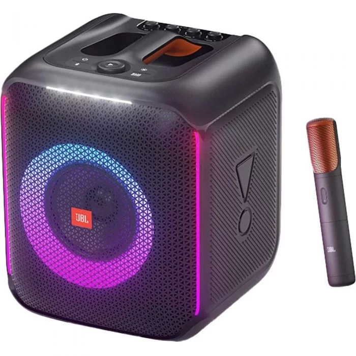 Difuzorul portabil JBL PartyBox Encore va ofera 10 ore de distractie non-stop. Cu manerul usor de prins si deplasat si designul rezistent la stropire, poti oricand sa iei petrecerea cu tine. Obtine ritmul cu sunetul uimitor JBL Original Pro si un bass profund. Sincronizati luminile stroboscopice, inelul si clubul pentru o experienta extraordinar de captivanta sau cantati impreuna cu microfonul digital wireless premium JBL, optimizat pentru karaoke cu control pentru ecou, bass si inalte. True Wireless Stereo inseamna ca puteti chiar sa asociati difuzoarele pentru un sunet cu adevarat impresionant. Si cu aplicatia PartyBox, iti poti controla oricand muzica si culorile spectacolului de lumini pentru o atmosfera perfecta.