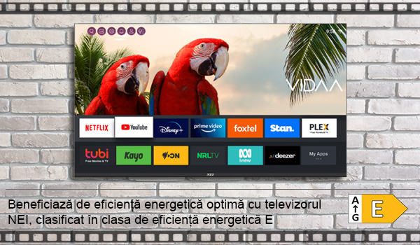 Beneficiază de eficiență energetică optimă cu televizorul NEI, clasificat în clasa de eficiență energetică E, care asigură un consum redus de energie și respect pentru mediu.